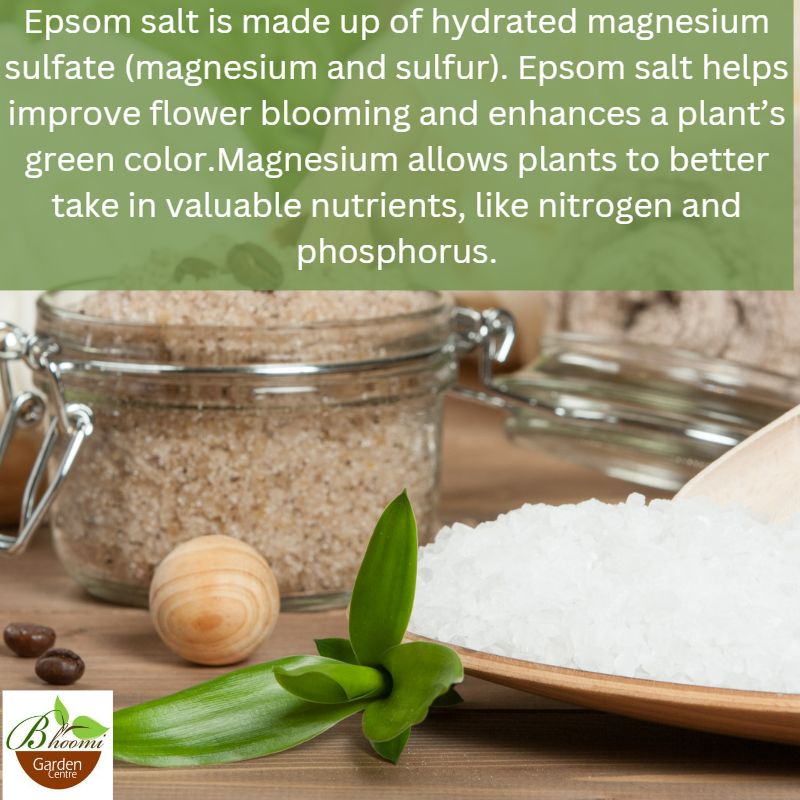 • Application: Foliar Application – Take 1 tablespoon of Epsom salt / litre of water , mix well & Spray directly on the leaves ; Soil Application – Apply 20 grams of Epsom salt at the Root zone ( per plant ) once in 15-20 days