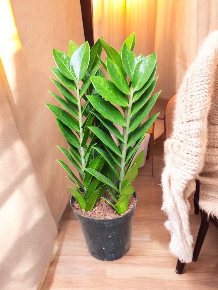 The Zamia Green, commonly known as the ZZ Plant (Zamioculcas zamiifolia), is a hardy, low-maintenance indoor plant with waxy, green leaves that grow in a unique feather-like arrangement. It’s popular for its resilience, even in low light conditions.